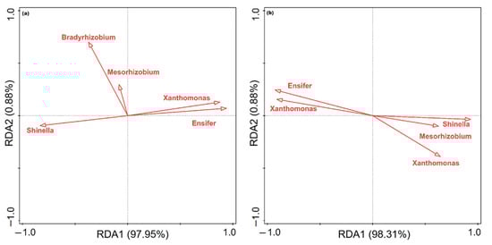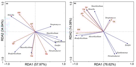 RDA results showed that in the N1P1K1 and N1P0K1 treatments, the two canonical axes explaining the soil physicochemical properties of the phoD-harboring bacterial community were 92.81% and that soil TP was an important factor affecting the phoD-harboring bacterial community (Figure 8a). In the N1P1K1 and N0P0K0 treatments, the two canonical axes explaining of soil physicochemical properties in the phoD-harboring bacterial community were 90.70% and soil AN was an important factor affecting the phoD-harboring bacterial community (Figure 8b). The Ensifer was a factor that significantly influenced the changes of soil P morphology in the N1P1K1 and N1P0K1 treatments (Figure 9a). Shinella, Sinorhizobium, and Bradyrhizobium were factors that significantly affected soil P morphology changes in the N1P1K1 and N0P0K0 treatments (Figure 9b). In the Pearson correlation analysis carried out to evaluate the relationship between dominant genera and P fractions, it was found that Shinella showed a statistically significant positive correlation with all P fractions except Residual-P. In contrast, Ensifer exhibited a significant negative correlation with NaOH-Po. Moreover, Bradyrhizobium was discovered to have a statistically significant positive correlation with Conc. HCl-Po (Table S6).
