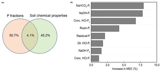 The VPA plot exhibits the correlation between environmental variables and P fractions, plant height, yield, and P uptake (a). Random forest model analysis conducts to pinpoint the primary predictors that significantly influence yield (b).