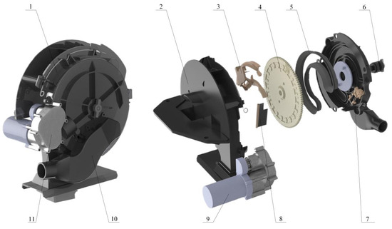 Seed-metering device structure. 1. air chamber shell; 2. seed chamber shell; 3. seed cleaning mechanism; 4. seed metering plate; 5. air chamber sealing ring; 6. axle components; 7. seed unloading roller; 8. Seed-retaining brush; 9. drive motor; 10. negative pressure inlet; 11. motor reducer.