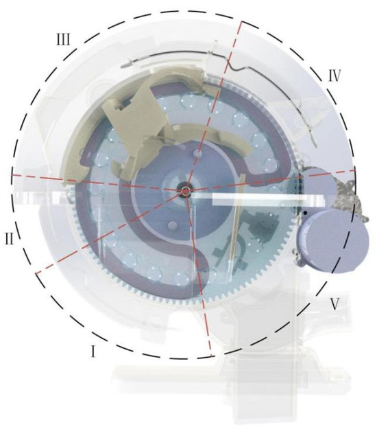 Division of the seed metering device’s working areas. I. seed filling area; II. transition area; III. seed cleaning area; IV. seed transporting area; V. seed dropping area.
