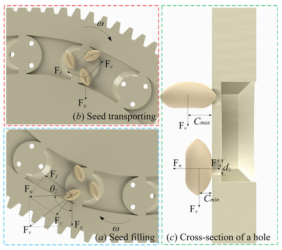 In the equation, all the force units are in Newtons (N); θ2 represents the angle between Fg and Fu, measured in radians (rad); and c denotes the distance from the centre of mass of the grain to the centre of the hole, measured in metres (m). P is the pressure generated by a single hole, measured in Pascals (Pa); S is the cross-sectional area of the hole, measured in square metres (m2). Solving Equation (8) at the instant of seed filling yields:
