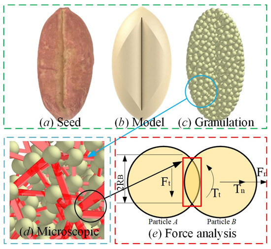 Figure 5 shows the three-dimensional modelling of the grain shape with “Xindong No. 52” wheat as a reference. To ensure that the particle volume is smaller than the grid volume of the contact surface in subsequent fluid-solid coupling simulations, the model was discretised in EDEM (2022) by filling the interior of the 3D model with small spherical particles bonded together through bonding bonds (d) [24]. This procedure resulted in obtaining the necessary bonded particle model (BPM) of wheat grains for simulation purposes (c).