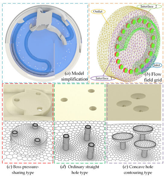 To minimise the computational expenses of the simulation, the intricate model of the seed-metering device was simplified, as depicted in Figure 6a. The crucial structural parameters of the seed chamber, air chamber, seed-metering plate, and seed-cleaning device were retained. The internal flow field model grid for the seed-metering device was established via ICEM (2020), as demonstrated in Figure 6b. Notably, both the dimensions and configuration of the seed apertures substantially influence the negative pressure and velocity distributions within the air chamber flow field [26]. The diameter range of 1.6–2.0 mm for the seed apertures was determined based on prior theoretical computations. Furthermore, three distinct types of seed apertures were devised (as illustrated in Figure 6): boss pressure-sharing (c), ordinary straight hole (d), and concave hole contouring (e). For each category of seed aperture structure, three sets of flow field simulation models were formulated.