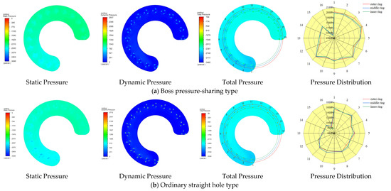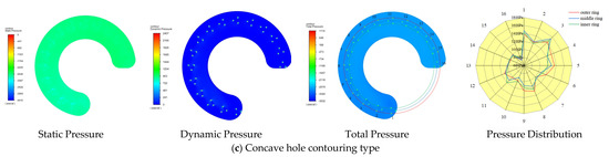 As depicted in Figure 7, the Fluent simulation results exhibit distinct variations in flow field distributions within the air chamber attributed to different types of seed holes. The negative pressure airflow enters the negative pressure chamber through the inlet, generating an annular negative pressure zone that gradually diminishes towards the periphery and eventually fills the entire negative pressure chamber. The figure shows static pressure, dynamic pressure, and total pressure contours of the air chamber flow field cross-section from left to right, accompanied by parameterised radar plots illustrating the total pressure distribution for each type of seed hole.