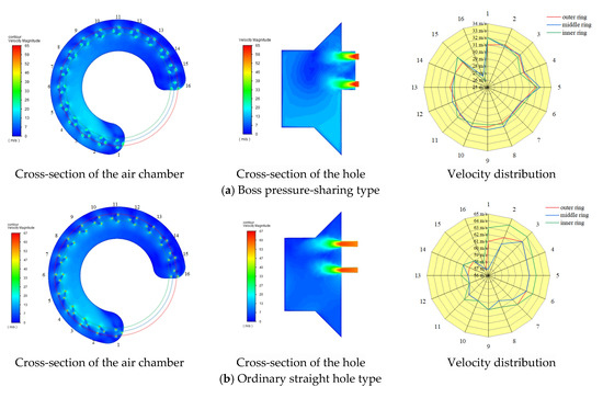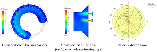 The velocity contour maps in Figure 8 illustrate the distribution of flow velocities across various regions, encompassing the air chamber cross-section, hole cross-section, and radar chart parameterising velocity from left to right. The figure clearly shows that the flow velocity is greater at the wall where it contacts and collides with the sealing ring, whereas it is lower in the annular central area, particularly at the hole. A comparison of the three types of velocity distributions reveals that the flow velocity at the centre of the pressure-dividing boss plate hole is the lowest, displaying a more uniform distribution with minimal fluctuations and a slower reduction in speed. The flow velocity is approximately 26–32 m·s−1. An examination of the cross-sections at the holes reveals that a high-speed region is concentrated on the outer surface of the hole, whereas a low-speed wake is distributed within the pressure-dividing structure of the seed-metering plate, minimising the impact on the internal flow velocity in the air chamber and facilitating stability within the internal flow field. In contrast, wakes from the other two types extend extensively within air chambers with high-speed regions that fill entire holes, resulting in elevated wind speeds, rapid reductions in speed, low energy utilisation efficiency, and increased loss rates. Considering the simulation test results for both the pressure and velocity distributions within the flow field, the pressure-dividing boss plate hole was selected for subsequent experiments involving precision wheat seed-metering plates.