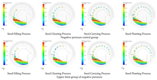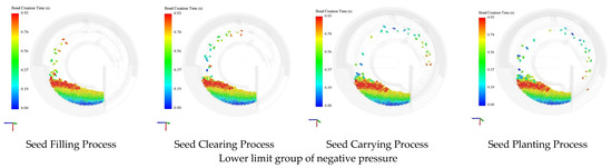The simulation results illustrate the pneumatic seed-metering device operation under these three different negative pressure conditions and are presented through images captured at regular intervals, as shown in Figure 9. The particles are colour-coded based on their generation time to facilitate observation of seeds adhering to the seed-metering plate within the filling area.