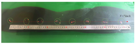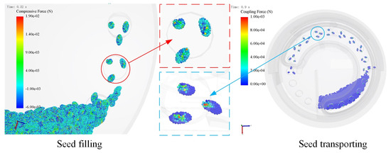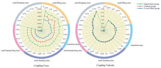 To specifically observe the forces acting on the particles during the process of capturing and transporting seeds by the seed metre from a microscopic perspective, as illustrated in Figure 10 and combined with earlier theoretical calculations, we can discern that when a seed is captured by the shaped hole, it experiences pressure as a result of interacting with the hole. This phenomenon is depicted in the figure by darker-coloured particles experiencing greater forces. As the seed moves uniformly in a circular motion with the seed metre disc, it encounters coupled drag forces influenced by the flow field. The figure shows that different adsorption areas yield varying values of the adsorption drag force, which is primarily concentrated at the intersection between the shaped hole and each individual seed. In all three simulation experiments, a single seed particle at an identical initial position was selected for extraction of the coupled drag force and circular motion velocity data. The analysis is presented in Figure 11.