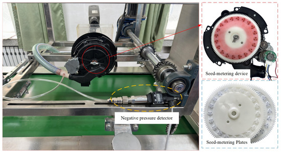 Xindong No. 52 wheat grain was employed as the experimental material, with a hole spacing of 10 to 15 cm. The JSP-12 seed metre performance test bench (Heilongjiang Agricultural Machinery Engineering Science Research Institute, Heihe, China) served as the bench test instrument, as depicted in Figure 12. An electronically controlled small fan was utilised to provide negative pressure and maintain stable negative pressure levels through a specific program. The wheat seed metre adopted a low-position seed drop to concentrate three seeds into a single hole. The test bench simulated the relative motion between the seeder and the ground, whereas an accurate negative pressure detection device read real-time negative pressure inside the air chamber of the seed metre.