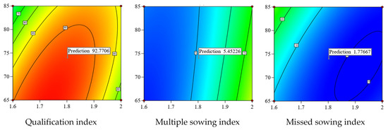 After thorough examination and analysis of the regression models, the seed plate speed, punch hole diameter, and negative pressure vacuum level served as the primary and secondary factors influencing the qualification index, respectively. Similarly, for both the multiple sowing index and missed sowing index, the seed plate speed, along with the negative pressure vacuum level, play a significant role as primary or secondary factors. Additionally, the impact of the interaction term X1X2 on the experimental indicators was scrutinised while maintaining a fixed negative pressure vacuum level at 3 kPa; this analysis is further illustrated in Figure 13.