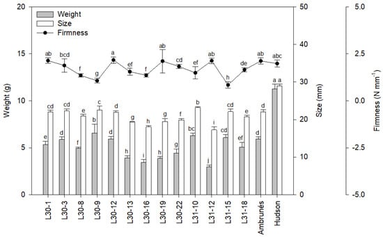 Average weight (g), size (mm), and firmness (N mm−1) of two years of the new and the parental cultivars. Values are shown as the mean of the two years, together with the standard deviation (SD). Different letters in each plot indicate significant differences.