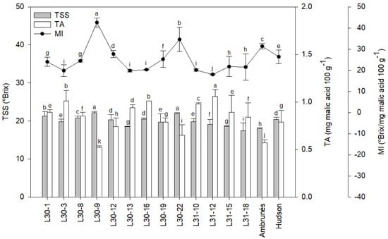 On the other hand, as seen in Figure 2, the total soluble solids (TSS) and titratable acidity (TA) were generally higher in the new cultivars than the parental cultivars. The TSS values varied between 17.38 and 22.13 °Brix, while the TA values ranged between 0.52 and 1.06 g malic acid 100 g−1 FW. Regarding TSS, all cultivars except one (L31-18) overcame ‘Ambrunés’, and five also overcame ‘Hudson’. Speaking of TA, all cultivars except for L30-12, L30-22, and L30-9 exceeded both parental cultivars. Also, L30-9 was the only cultivar with a lower TA than ‘Ambrunés’. Finally, the mature index (MI; Figure 2) ranged from 19.80 to 42.65. Four new cultivars enhanced the mature index of the ‘Hudson’ parental cultivar, and two also overtook the ‘Ambrunés’ parental cultivar.