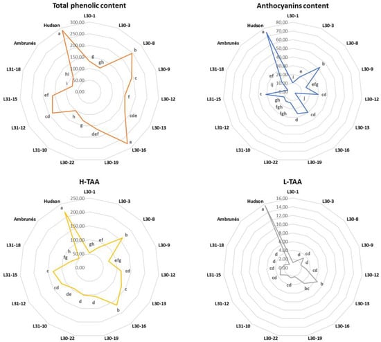 The total phenolic content ranged between 76.9 and 288.83 mg gallic acid 100 g−1 FW (Figure 3). Eleven out of the thirteen cultivars improved the content of phenols with respect to ‘Ambrunés’ (94.65 mg gallic acid 100 g−1 FW), although L30-16 (277.38 mg gallic acid 100 g−1 FW) was the only cultivar with a total phenolic concentration significantly similar to that of ‘Hudson’ (288.83 mg gallic acid 100 g−1 FW).