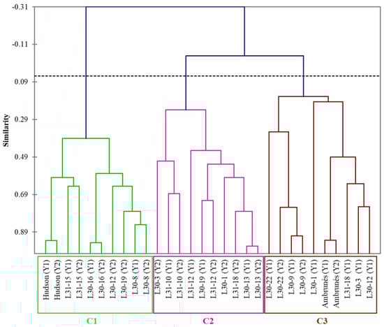 Within the group C1, it is important to note that although there are five new cultivars (apart from ‘Hudson’), only three of them are present in both years, so it would be these (L31-15, L30-16, and L30-8) that could be said to be similar to the ‘Hudson’ parental cultivar.