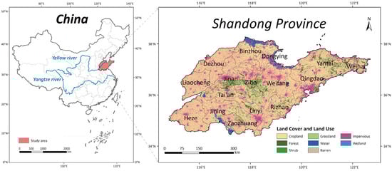 Shandong Province, located in eastern China between latitudes 34°22.9′ to 38°24.01′ N and longitudes 114°47.5′ to 122°42.3′ E (Figure 1), covers an area of 157,600 km2. Of this, 83,800 km2, or 53.17%, is cropland. As one of China’s major agricultural regions, Shandong is characterized by plains and a warm temperate monsoon climate, with ample sunshine and concentrated summer rainfall. The province operates a double-cropping system. Known as the Granary, Cotton, and Oil Repository and the Home of Fruits and Aquatic Products, Shandong has long led China in agricultural value-added. It is also a pioneering region for green, low-carbon, high-quality development in China.