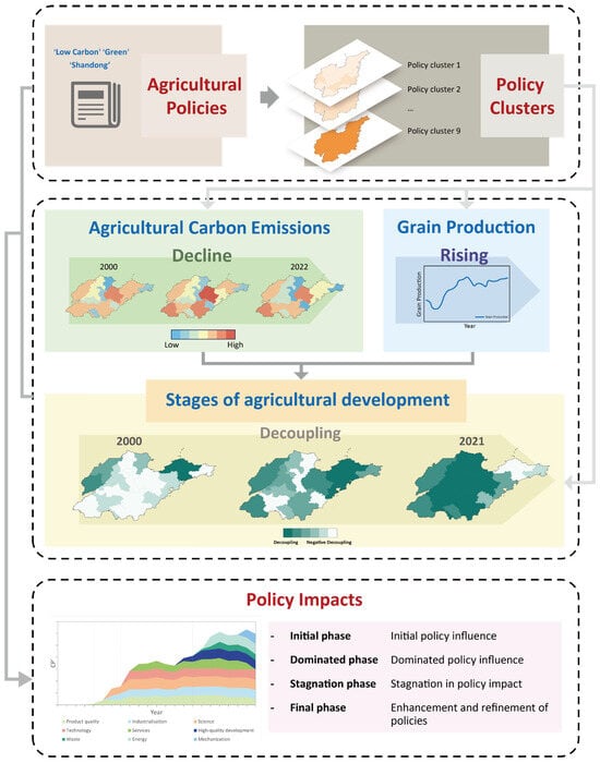 As China progresses toward its carbon peak and carbon neutrality goals, addressing agricultural carbon emissions has become increasingly critical. Agricultural carbon emissions and grain yield are central to agricultural production. To reduce carbon emissions while maintaining or enhancing crop yields, the Chinese government has implemented a variety of agricultural policies. Given the diverse focuses of these policies, it is essential to evaluate their effectiveness in reducing agricultural carbon emissions and supporting sustained agricultural production. This study assessed the impact of these policies by first identifying nine policy clusters on the basis of their modes of action and objectives, assigning scores according to their implementation frequency. The impact of these nine policy clusters on different stages of agricultural development, characterized by agricultural carbon emissions and grain yield, was analyzed, with their spatiotemporal characteristics summarized. Finally, the division of agricultural policy effects in Shandong informed specific policy recommendations. The findings aim to provide targeted policy recommendations for optimizing sustainable agricultural development in Shandong Province through effective policy implementation (Figure 2).