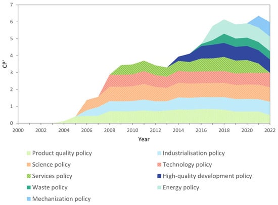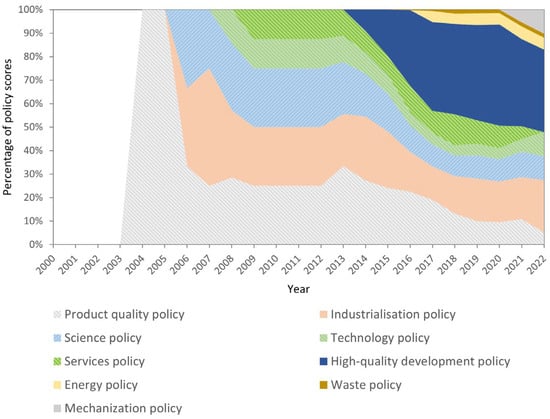 where Np,t,C is the number of times policy p is implemented in city C in year t. It counts how many counties in city C have implemented policy p. If all counties in city C have implemented policy p, it then counts the number of businesses, cooperatives, and other institutions included in the pilot list for policy p in city C. PSp,t,C is the score of agricultural policy p in city C in year t. CPSc,t,C is the score of cluster c in city C in year t. Figure 3 shows the percentage of nine policy cluster scores in all policy scores from 2000 to 2022.