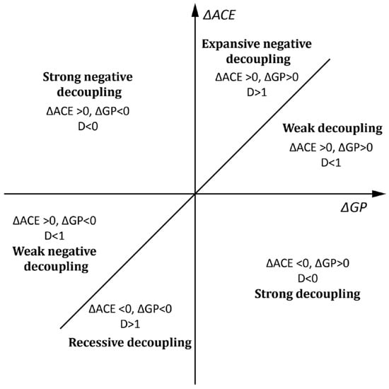 where D represents the decoupling coefficient between agricultural carbon emissions and grain production and ACE and GP denote agricultural carbon emissions and grain production, respectively. The variables t and 0 represent the target and base years, respectively, while ΔACE and ΔGP represent changes in agricultural carbon emissions and grain production over the specified period. When ΔGP is equal to zero, a very small 0.001 is used instead of 0 to ensure that the formula calculates correctly. The decoupling state is illustrated in Figure 4, where a smaller D indicates a stronger decoupling state when GP is greater than 0.
