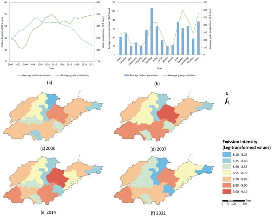 Agricultural carbon emissions in Shandong Province. In this context, (a,b) denote the average values of agricultural carbon emissions and grain production in Shandong Province, respectively; (c–f) represent the spatial distribution of agricultural carbon emissions in Shandong Province for the years 2000, 2007, 2014, and 2022.