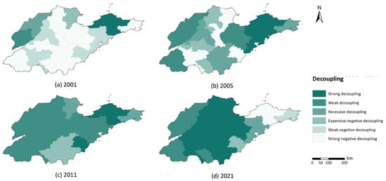 State of decoupling of agricultural carbon emissions. (a–d) represent the spatial distribution in 2001, 2005, 2011, and 2021, respectively.