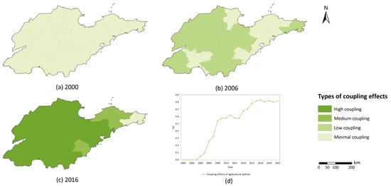 State of agricultural policy coupling. (a–c) represent the spatial distribution of agricultural policy coupling in 2000, 2006, and 2016, respectively. (d) represents the average coupling trends of agricultural policies.