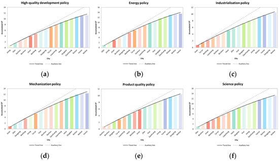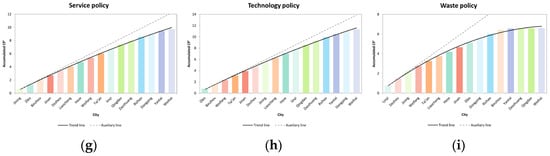 The effectiveness of agricultural policy clusters varies across cities (Figure 9). The cumulative average impact of the nine policy clusters shows that waste policies (Figure 9i) exhibit the greatest variability, while industrialization (Figure 9c) and technological policies (Figure 9h) show the least. This suggests that the implementation of industrialization and technology policies has been more consistent across cities, leading to uniform impact. By contrast, waste policies were primarily implemented through pilot programs, showing greater variability. Among cities, Zibo ranks highest in energy (Figure 9b), science (Figure 9f), and technology policies (Figure 9h), likely due to favorable agricultural conditions and investment in agricultural innovation. Jinan, the political and cultural center of Shandong, ranked first in industrialization and mechanization policies, benefiting from abundant resources and talent (Figure 9d). Jining leads in high-quality development (Figure 9a) and service policies (Figure 9g) due to local initiatives promoting green agriculture and product branding. Conversely, Yantai and Weihai consistently rank lower, reflecting limited policy impact on grain production.