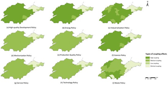 By 2021, all policy clusters had reached a relatively stable coupling state, making this year a representative point for analyzing the degree of coupling between agricultural policies and the decoupling process (Figure 10). Policy clusters had a small influence in the northeastern peninsula cities, where high-quality development, energy, and science policies had a greater effect (Figure 10a,b,f). Mechanization, product quality, service, and technology policies also had consistent spatial distributions, with medium levels across central cities (Figure 10d,e,g,h). The spatial distribution of industrialization policies (Figure 10c) and waste policies (Figure 10i) was more complex, with low coupling in northeastern cities, higher coupling in most central cities, and medium levels in cities like Dezhou, Zibo, and Rizhao.