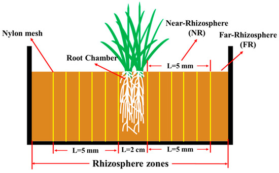 A multi-chamber root box prepared from polyvinyl chloride plastic (170 mm × 150 mm × 200 mm) was applied for the incubation experiment. The root box was divided into three zones using a 400-mesh nylon mesh, including the rhizosphere (R), near rhizosphere (NR), and far rhizosphere (FR), respectively (Figure 1).