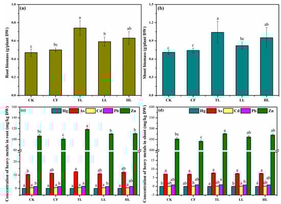 Changes in biomass of roots (a) and shoots (b) and heavy metal concentration of roots (c) and shoots (d). Different lower-case letters indicate significant differences between five fertilizer treatments samples (p < 0.05).