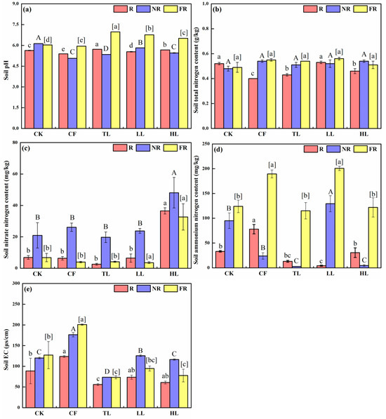 Soil fertility indexes of (a) pH, (b) total nitrogen, (c) nitrate nitrogen, (d) ammonium nitrogen, and (e) EC in root zones. Different upper-case, lower-case and bracketed letters indicate significant differences between five fertilizer treatments samples (p < 0.05) in R, NR and FR zones, respectively.