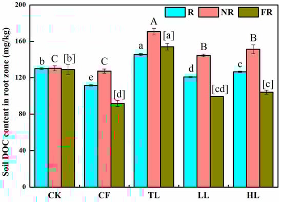 Soil DOC content in root zones. Different upper-case, lower-case and bracketed letters indicate significant differences between five fertilizer treatments samples (p < 0.05) in R, NR and FR zones, respectively.