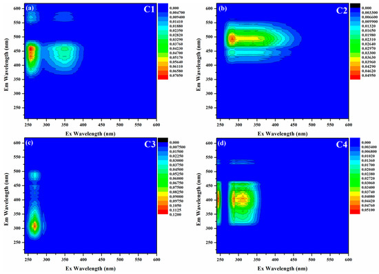 (a–d) Four fluorescence components of C1 to C4 obtained by EEM-PARAFAC analysis.