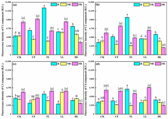 Fluorescence intensities of (a) C1 component, (b) C2 component, (c) C3 component, and (d) C4 component of soil DOM in root zones. Different upper-case, lower-case and bracketed letters indicate significant differences between five fertilizer treatments samples (p < 0.05) in R, NR and FR zones, respectively.