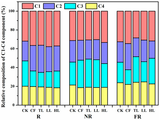 The changes in the DOM fluorescence components of root zones under different fertilization treatments are shown in Figure 6. Under different treatments, the component proportion of soil DOM showed a pattern of C1 > C2 > C3 > C4, with terrestrial humic acid-like substances dominating, accounting for 32.05–34.57% (Figure 7). The content of fluorescent components was significantly increased by the application of artificial humic acids, with the pure artificial humic acid treatment showing the greatest improvement effect with a 14.47% increase. The proportion of each component was similar. Artificial humic acids can significantly promote the accumulation of the terrestrial humic acid-like substance in the R zone. The C1 component of the R zone in the HL and TL treatments increased by 16.44% and 91.62%, respectively, compared to the CF treatment. The changes in the C2 component of the fulvic acid-like substance were consistent with those of the terrestrial humic acid-like substance. The C2 component of the R zone in the HL and TL treatments increased by 12.91% and 105.7%, respectively, compared to the CF treatment, while it decreased by 74.64% and 41.35%, respectively, in the FR zone. The protein-like substance in the R and FR zones can be enhanced by the use of artificial humic acids. The C3 component in the R zone showed a significant increase of 23.77% and 80.47% in the HL and TL treatments compared to the CF treatment. In the FR zone, the C3 component increased by 41.9% and 41.59% in the LL and TL treatments compared to the CF treatment. The marine humic acid-like substance can be transferred from the FR zone to the R zone after the application of artificial humic acids, which can increase by 88.57%. In the NR zone, the use of both artificial humic acids and chemical fertilizer led to a significant increase in the content of different fluorescent components. The content of C1-C4 components in the LL and HL treatments increased by 31.59–43.58%, 29.21–47.70%, 5.79–48.27%, and 24.34–47.98%, respectively.