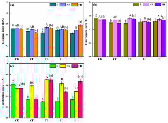 Fluorescence indexes of (a) biological index (BIX), (b) fluorescence index (FI), and (c) humification index (HIX) of soil DOM in root zones. Different upper-case, lower-case and bracketed letters indicate significant differences between five fertilizer treatments samples (p < 0.05) in R, NR and FR zones, respectively.