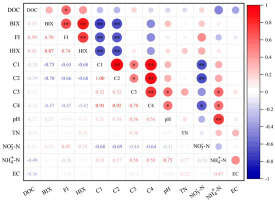 Figure 9 displays a correlation analysis of soil physicochemical properties and DOM spectral data. The DOC content is significantly positively correlated with the FI index (p < 0.05). The FI index is significantly positively correlated with BIX and HIX (p < 0.01) and significantly negatively correlated with the fluorescence intensity of the C1 and C2 components (p < 0.01). The BIX index is significantly negatively correlated with the C1 and C2 components (p < 0.05) and significantly positively correlated with HIX (p < 0.01). HIX is significantly negatively correlated with C1 and C2 components (p < 0.01). The C1 component is significantly positively correlated with the C2, C3, and C4 components (p < 0.05), while it is significantly negatively correlated with ammonium nitrogen (p < 0.01). The C2 component is significantly positively correlated with the C3 and C4 components (p < 0.05), while it is significantly negatively correlated with ammonium nitrogen (p < 0.01). The C3 component is significantly positively correlated with the C4 component, soil pH value, and nitrate nitrogen (p < 0.05), while it is significantly negatively correlated with ammonium nitrogen (p < 0.01). The C4 component is significantly positively correlated with soil pH and nitrate nitrogen (p < 0.05), while it is significantly negatively correlated with ammonium nitrogen (p < 0.01).
