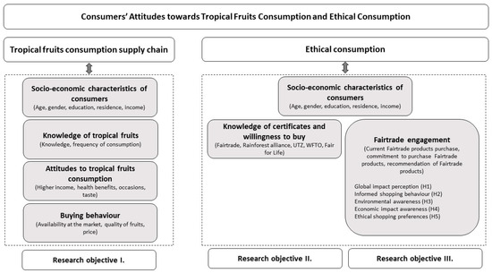 To fulfil the main research question mentioned above, we developed a conceptual research design that follows our three objectives (Figure 1). In the first phase, we concentrated on tropical fruit consumers’ knowledge, attitudes, and preferences. In the second phase, we analysed consumers’ attitudes towards ethical consumption and knowledge of certifications, focusing on the Fairtrade label as the most visible system of ethical and sustainable international certification in the region. Finally, we constructed a structured model that associates engagement with Fairtrade fruit with the other five independent constructs of consumers’ attitudes.