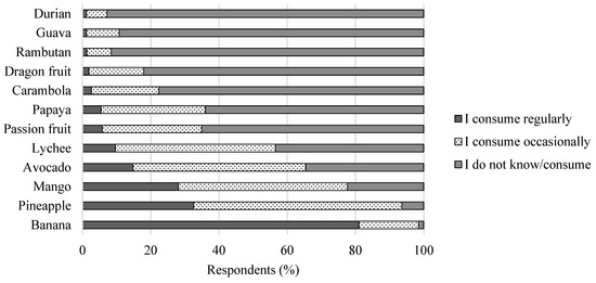 The findings related to our first objective indicate that the most frequently consumed fruits among Czech consumers are bananas (99%), pineapples (94%), and mangoes (78%) (Figure 2). The next most preferred category of tropical fruits, which are consumed regularly or occasionally by at least 50% of the respondents, includes avocados (65%) and lychees (57%). Other tropical fruits are consumed regularly or occasionally by fewer than 36% of the respondents. In contrast, the least familiar tropical fruits are guava (11%), rambutan (8%), and durian (7%).