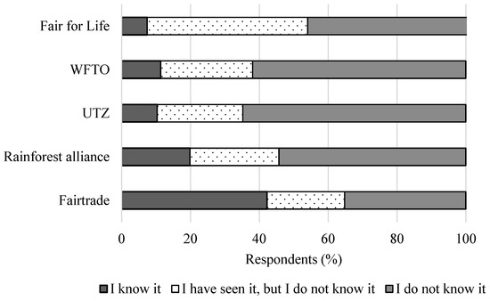 In the second phase of the research, we focused on analysing consumer attitudes towards ethical consumption in order to fulfil research objectives 2 and 3. Owing to the worldwide COVID-19 pandemic, the second part of the data was collected in the summer of 2022. The questionnaire was distributed in the Czech Republic through a professional company, Median, which specialises in public surveys. Participation was voluntary and self-administered to all participants who answered the questionnaire anonymously. The cross-sectional questionnaire consisted of 17 multiple-choice questions. First, we focused on knowledge of the ethical certificates that are commonly available in the Czech market. For the purposes of this study, we selected five certificates, namely, Fairtrade, Rainforest Alliance, UTZ, Fair for Life, and World Fair Trade Organization (WFTO). Although UTZ merged with the Rainforest Alliance in 2018, we kept both certificates, as they are still available on the market.