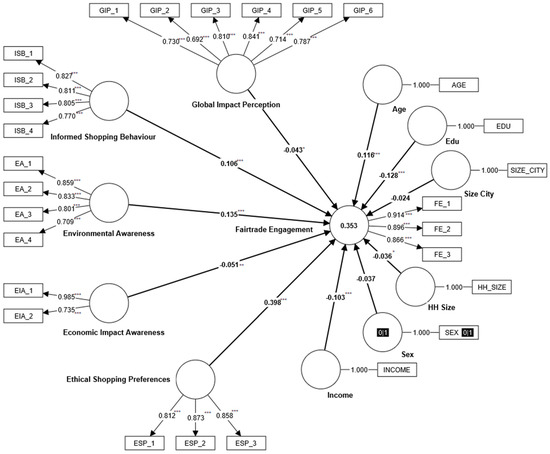 For the SEM, the conceptual model consisted of six latent variables (one dependent and five independent), each with at least two observed variables. All variables, except for Fairtrade engagement, represent our exogenous variables. The variables potentially influencing the Fairtrade engagement were identified in the literature. They are also summarized in Table 1. In addition to the five exogenous variables in our model, we included six control variables (sociodemographic characteristics of the respondents) that could influence Fairtrade engagement. The model was constructed around the major construct specified in the conceptual framework—Fairtrade engagement—based on the three measured items: (i) consumption of Fairtrade products, (ii) intention to continue consume them, and (iii) the likelihood of recommending them to other buyers.