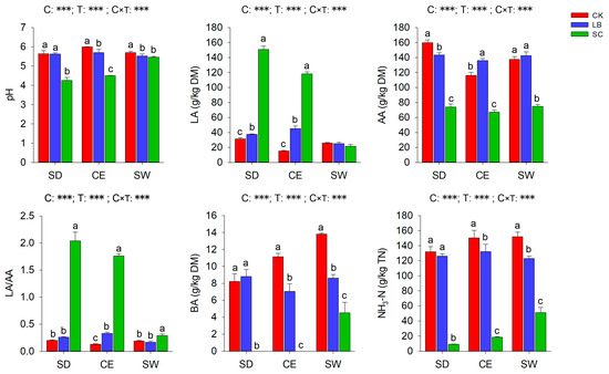 Fermentation characteristics of alfalfa silages prepared with different cultivars and additives. SD, CE, and SW indicate alfalfa cultivars Sanditi, Celsius, and SW5909, respectively. CK, control; LB, silage treated with LAB inoculant; SC, silage treated with sucrose addition. LA, lactic acid; AA, acetic acid; LA/AA, lactic to acetic acid ratio; BA, butyric acid; NH3−N, ammonia nitrogen; TN, total nitrogen. Means with different letters indicate significant differences among additive treatments of the same alfalfa cultivar (p < 0.05). C, alfalfa cultivar; T, additive treatment; C × T, interaction between alfalfa cultivar and additive treatment. ***, p < 0.001.
