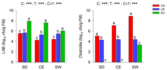 Compared to CK, LB and SC treatments increased (p < 0.05) LAB count, and the highest number was observed in SC treatment regardless of alfalfa cultivar (Figure 2). In terms of alfalfa cultivar, a higher (p < 0.05) LAB count was found in alfalfa SD compared to CE and SW when the same additive treatment was applied. The proliferation of Clostridia in alfalfa silage was effectively inhibited (p < 0.05) because of LB and SC treatments, especially for the SDSC and CESC groups in which Clostridia was undetectable.