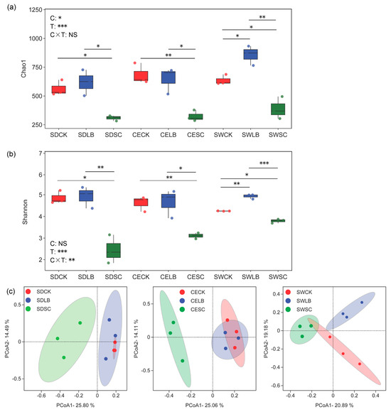 The alpha diversity of the bacterial community is displayed in Figure 3. Compared to silage CK, SC treatment decreased (p < 0.05) the indexes of Shannon and Chao1, while these indexes both increased due to LB treatment, although not all differences were significant. The variance in the bacterial communities among the different silage groups was clearly reflected by the PCoA. Component 1 and component 2 could explain 20.89–25.80% and 14.11–19.18% of the total variance, respectively. In terms of alfalfa SD and CE, the bacterial community in silage SC was clearly separated from silages CK and LB, while there was an intersection between the CK and LB samples. The bacterial community in alfalfa SW silage could be clearly divided into three groups according to various additive treatments.