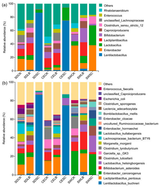 The bacterial community at the genus and species levels is illustrated in Figure 4. Undesirable Enterobacter, unclassified Lachnospiraceae, Bifidobacterium, Rhabdanaerobium, Clostridium sensu_stricto_12, and Caproiciproducens dominanted the microbiota in silage CK, with the total relative abundance ranging from 31.72% to 59.15%. These undesirable bacteria were also detected in silage LB, with the total relative abundance ranging from 40.37% to 45.17%, although the relative abundance of favorable Lentilactobacillus, Lactobacillus, and Lactiplantibacillus increased (p < 0.05) due to LB treatment compared to silage CK. It is worth noting that Clostridium sensu_stricto_12 was promoted (p < 0.05) because of LB treatment compared to silage CK. After SC treatment, anaerobic fermentation underwent a shift from undesirable bacteria to Lactobacillus and Lentilactobacillus. In the SDSC and CESC groups in particular, the relative abundance of Lentilactobacillus was 86.61% and 74.97%, respectively.