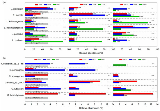 Astatistical comparison of the top six Clostridia and LAB species of alfalfa silage is illustrated in Figure 5. L. buchneri, L. pentosus, L. helsingborgensis, L. kullabergensis, E. faecalis, and Lactiplantibacillus plantarum were the most dominant LAB species, and their relative abundance varied across the different alfalfa cultivars and additive treatments. L. buchneri became more abundant (p < 0.05) in the silage SC of alfalfa SD and CE, which resulted in the high fermentation quality of these silages. LB treatment promoted (p < 0.05) L. pentosus, rather than L. buchneri and L. plantarum in the inoculant, compared to silage CK and SC. The relative abundance of L. helsingborgensis and L. kullabergensis also increased (p < 0.05) due to LB treatment compared to silage CK. It is worth noting that L. helsingborgensis and L. kullabergensis were the top three LAB species in silage SC, which might be associated with LA fermentation. The relative abundance of E. faecalis in alfalfa SD and SW silages was in the following order: CK > LB > SC. L. plantarum was rarely detected in all alfalfa silages, with a relative abundance of lower than 1%.