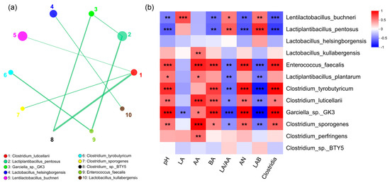Interaction networks of the top six Clostridia and LAB species (a) and Spearman correlation heatmap of the top six Clostridia and LAB species and fermentation parameters (b). Nodes along the red line are positively correlated, while nodes along the green line are negatively correlated. The size of the nodes is directly proportional to the abundance of the species in all samples. *, ** and ***, represent 0.01 < p < 0.05, 0.001 < p < 0.01 and p < 0.001, respectively.