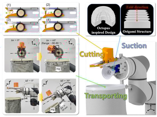 One key idea for improving work efficiency is to develop a harvesting system inspired by how human operators perform. The human approach is shown in Figure 1. Therefore, this study developed a human-centered robot system by considering the manual harvesting process for improving work efficiency. The developed harvesting robots consist of perception (i.e., detecting and harvest ordering), visual servoing (i.e., approaching), and end-effector (i.e., grasping and cutting) systems [25]. Because the performance of each component is directly related to work efficiency, the design was performed considering unstructured environments. The designed end-effector consists of cutting, grasping, and transporting modules, as shown in Figure 2, with detailed descriptions of each module provided in [26]. Among them, the transporting module is structured to enable transport simultaneously with harvesting. However, since it is mounted at the lower part, it may frequently collide with crops due to the movements of end-effector. Therefore, the transporting module is designed to maintain its posture, adapting to changes in the tilt angle, () in the y-z plane and () in the x-z plane, ensuring stability throughout operation.