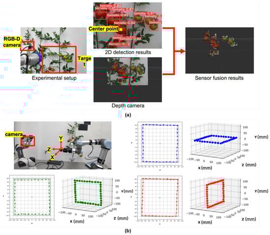 Three-dimensional localization of the target fruit; (a) the procedure of localizing fruits by fusing 2D detection results and depth information. (b) experimental demonstration of measuring the localization accuracy.