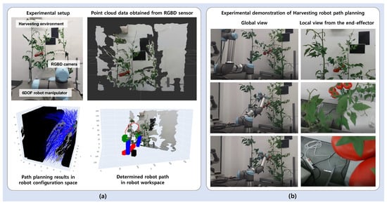 Obstacle-class-dependent-probability-based path planning for tomato harvesting robot; (a) experimental setup determining the safe path using the point cloud data and (b) experimental demonstration of the harvesting robot following the determined path, with views from the global and the end-effector cameras.