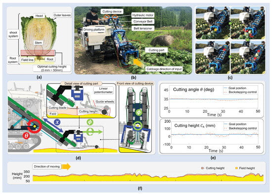 Korean cabbage harvester [27]; (a) structure of a Korean cabbage, (b) harvesting process of the developed harvester, (c) attitude control system of the cutting device, (d) verification of goal position following, and (e,f) harvesting of Korean cabbage using an attitude control system.