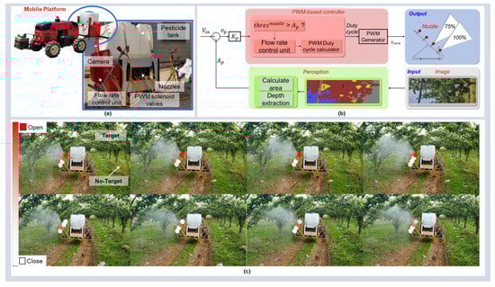 Pesticide application is an important agricultural task to enhance the productivity and quality of cultivated crops, and thereby, food supply worldwide [28]. This task is typically accomplished through extensive spraying to mitigate the probability of pest occurrence and address the associated unstructured environments. Notably, this method may expose workers to harmful substances and lead to soil changes and economic losses owing to the indiscriminate use of pesticides. Another key problem is unintended area spray drift, which may result in loss of productivity owing to damage to crops in other fields. These problems can be overcome by developing an intelligent spraying control system that sprays appropriate amounts of pesticides in a perceptive manner (by detecting trees or spray drift) to enhance the stability and economic benefits for farmers [29,30].